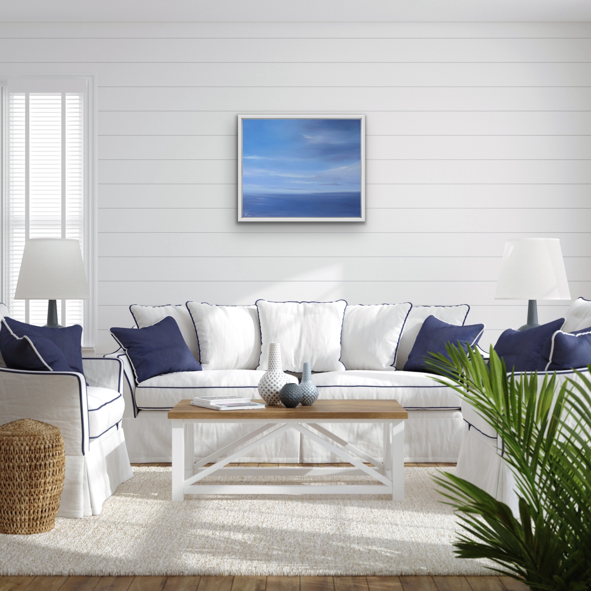 The painting is presented in a white wooden frame.